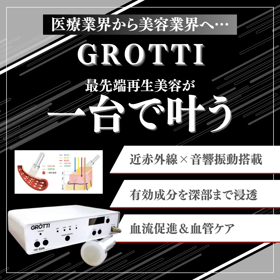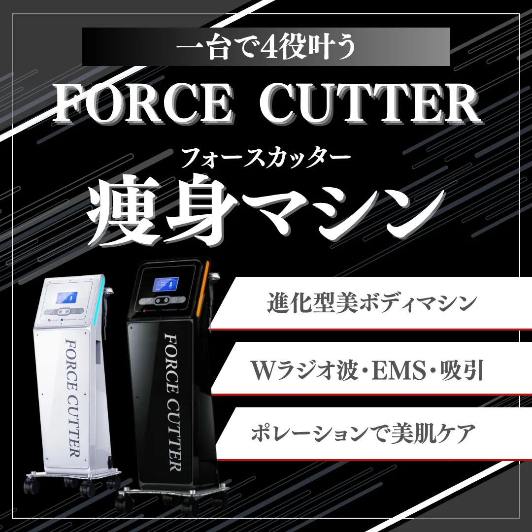 痩身メニューには、業界でも高評価のマシン「グロッティ(GROTTI)」や「フォースカッター(Force Cutter)」「セルドライブプロ」を導入。ラジオ波・EMS・吸引・LED・ポレーション等の先端テクノロジーで、硬い脂肪やむくみ、セルライトなど多様な肉質に幅広くアプローチし、引き締まったボディラインを実現します。